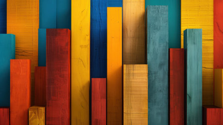 Vibrant wooden blocks various colors create striking visual display, showcasing blend of blue, yellow, red, and green hues. This colorful arrangement evokes sense of creativity and artistic