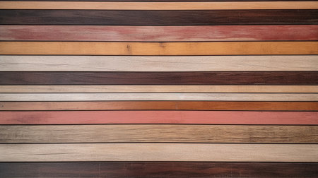 A vibrant and colorful arrangement of wooden planks displaying various shades and finishes, creating an abstract pattern ideal for artistic designs and backgrounds.
