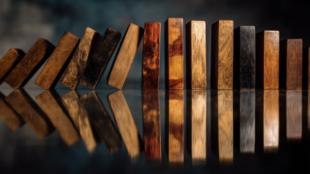 Artistic arrangement of wooden blocks captured on a reflective surface, showcasing a medley of colors and textures, creating a peaceful visual harmony.