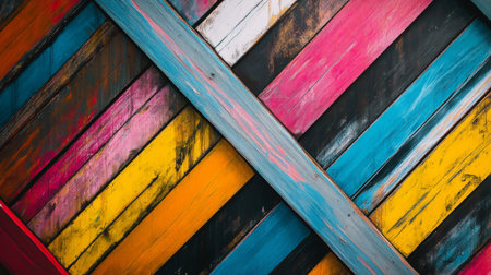 Diagonal wooden planks in multiple colors, creating a vibrant, rustic, and textured pattern.