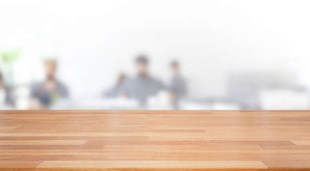 A beautiful empty wood board with white blur people in bright indoor cafe background .For montage product display or design key visual layout background.