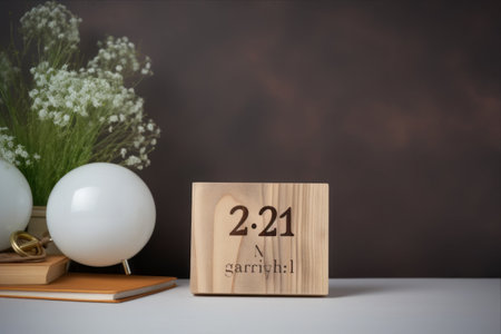 2021 happy new year wood number (3d rendering) on wood table background with sunlight window create leaf shadow on wall with blur green plant foreground.panoramic banner mockup for display product