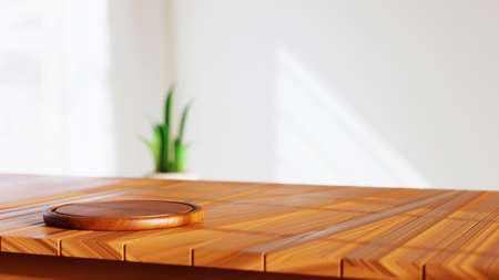 A beautiful wooden table surface capturing a serene atmosphere with soft background plants, perfect for food photography or product displays in a cozy setting.