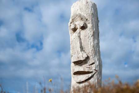 Driftwood totem on dunes at Ohope, Bay off Plenty, New Zealand.