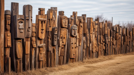 Artistic photo of a series of small timber totems lined up, each featuring unique cultural symbols. AI generated.