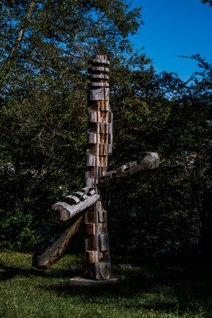 Wooden sculpture in the forest on a sunny summer day with blue sky