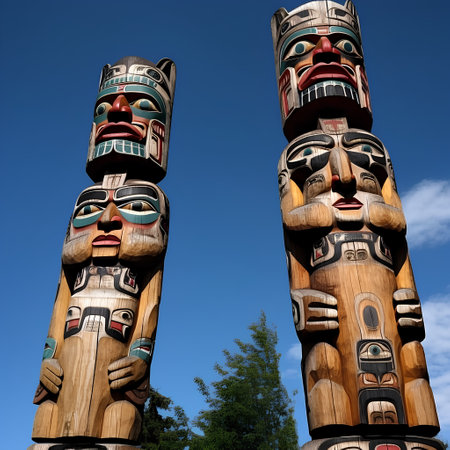 Close up of colorful totem poles showcasing intricate carvings and vibrant colors, representing native american heritage