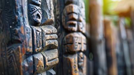 This close-up image showcases intricately carved wooden totem poles, highlighting rich textures and patterns that celebrate cultural heritage in natural light.