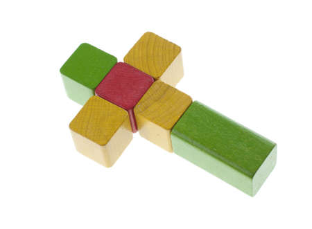 Cross concept built with wooden play cubes. Isolated on white