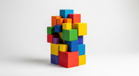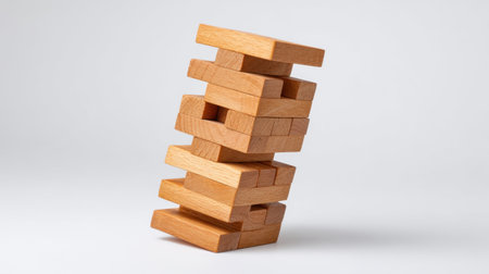 This image showcases a stack of wooden blocks leaning at a slight angle against a soft white background, ideal for creative and educational themes.
