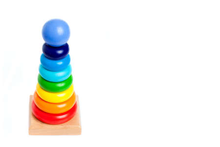 A big pyramid build from multi colored wooden rings on a vertical stick, toys for babies isolated on a white background with copy space.