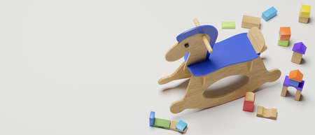 3D rendering, rocking horse, toys, stuffs, playthings and copy space on white background, 3D illustration