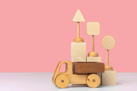 Wooden toy car truck and toy road signs stand on wooden cubes arranged in the form of a pyramid staircase. Mockup for delivery business, logistics. Copyspace on pink background