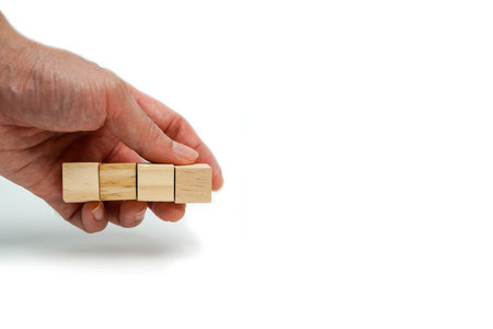Man's hand placing wooden cube on white background, business concept.