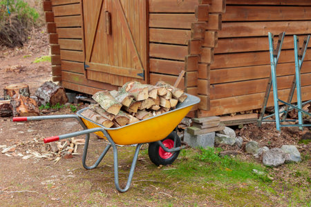 Yellow metal garden wheelbarrow and stacked firewood near storage shed. Preparing logs for winter heating, sustainable living, rural lifestyle in Finland
