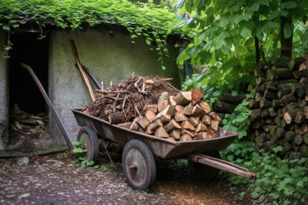 firewood in a rustic wheelbarrow outdoors, created with generative ai