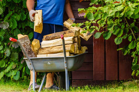 Man working with firewood, unloading wood from wheelbarrow. Preparation for winter.