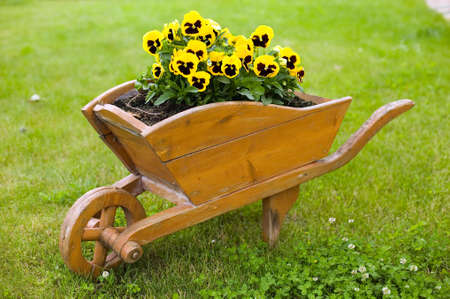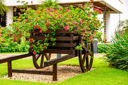 decorative wooden cart with flowers in the garden on the lawn