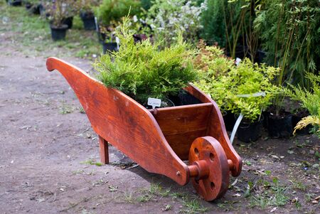 Wooden wheelbarrow with thuja shrubs