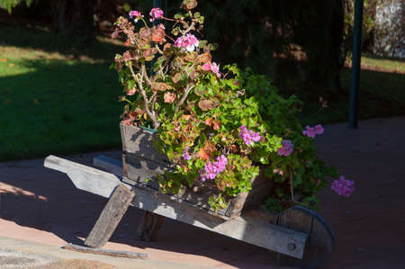 Wooden wheel barrow with blooming geranium plant. Countryside outdoor design