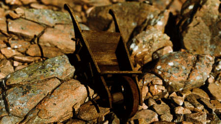 abandoned wooden mine wheelbarrow on rocks