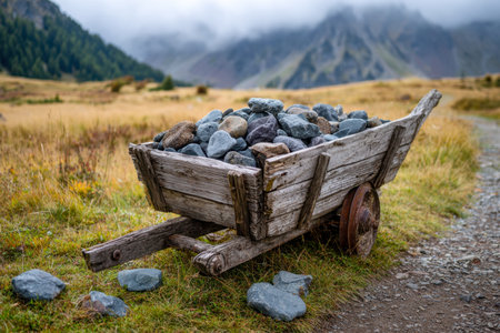 A weathered wooden cart brimming with smooth rocks rests amidst lush farmland, with fog-shrouded peaks looming softly in the gray, overcast landscape.