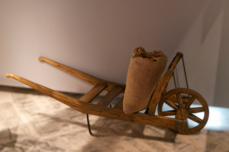 A wooden wheelbarrow stands on a stone floor, holding a burlap sack. The rustic piece showcases old agricultural tools, reflecting a simpler time in farming.