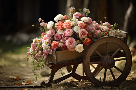 Photo a wooden cart with plants and flowers. Rustic surroundings. identity. For postcards, for banners.