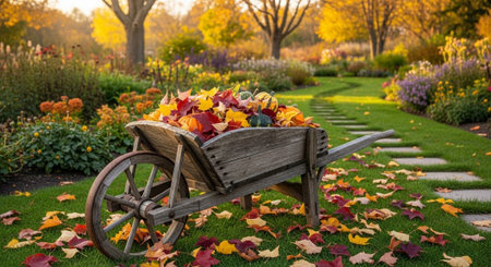 A rustic garden cart sits among a carpet of autumn leaves, creating a serene and picturesque scene ideal for seasonal decor and outdoor settings.