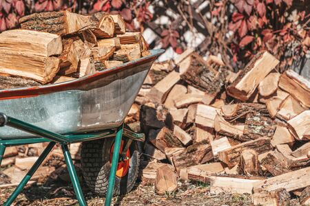 Cut firewood in wheelbarrow