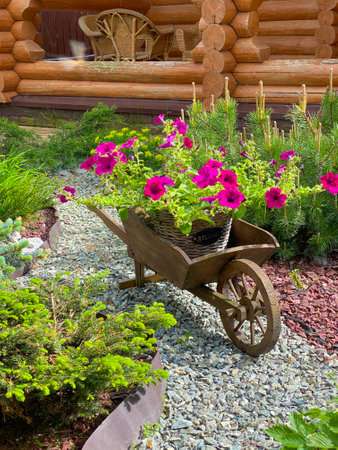 A decorative wheelbarrow stands on the stones in the garden, flowers and grass are planted in the cart. In the background is a garden path, a garden and a porch of the house. Traditional German decor. antiques. Garden decor and garden decoration. close-up