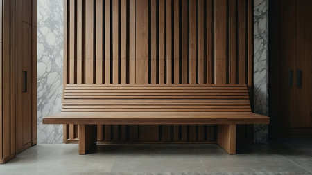 a white bench is positioned against a plain concrete wall, showcasing a dark silver and brown color scheme. the architectural focus of this shin hanga-inspired scene lies in the reinforced concrete construction, orderly symmetry, and minimalist abstracts created with wood elements. ai generated