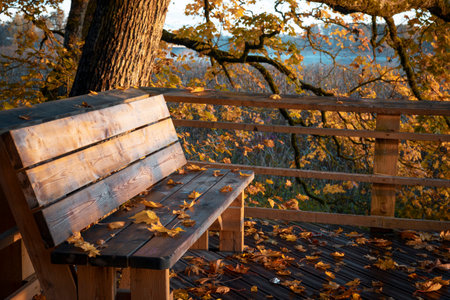 Wooden bench for hikers in the countryside on a warm autumn day
