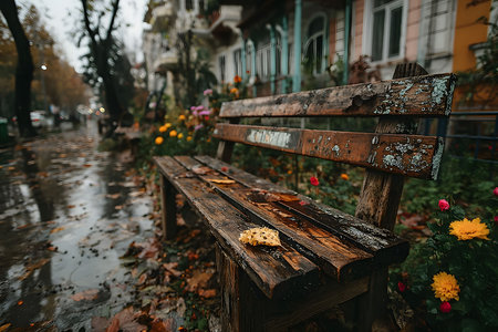 Weathered wooden bench surrounded by vibrant flowers and fallen leaves on a rainy day in an urban park. the scene essence of autumn with its rich colors and textures, creating a serene and contemplative atmosphere. Generative AI