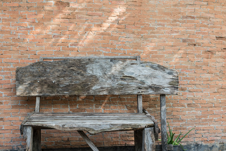 Old wooden brown bench with old brick wall