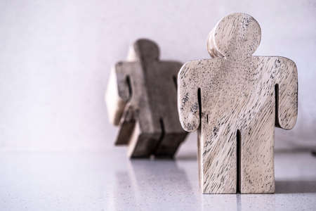 figures of man and woman made with wood on a neutral background