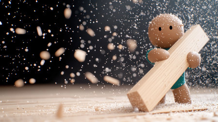 A cartoon carpenter figure, holding a wooden plank, is surrounded by flying sawdust. The figure is brown with a teal shirt.