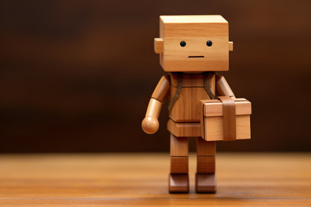 Wooden figurine of a delivery man on a wooden surface.