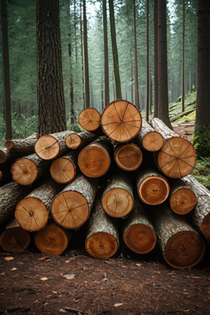 Log trunks pile, timber harvesting. Pile of wooden logs prepared for removal. Logging timber wood industry, timber transportation in forest. AI-Generated image