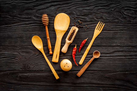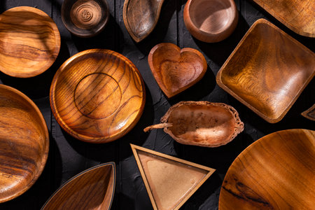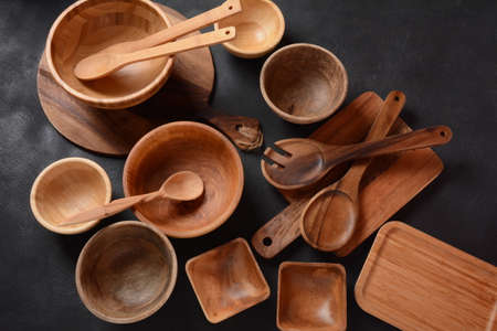 Wooden bowls and containers, kitchen utensil on dark rustic background