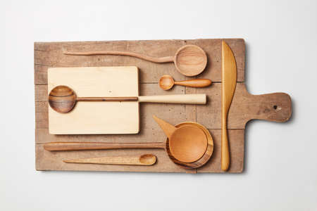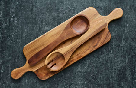 Wooden spoons on cutting boardfrom wood on gray background, top view, closeup. Kitchen utensils