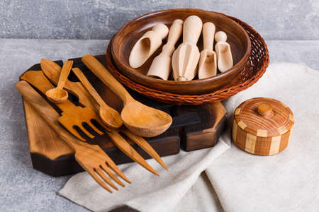 On a wooden background are wooden cutlery - a spatula, two spoons, a fork. On a cutting board there is a wicker from a vine plate.
