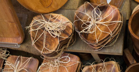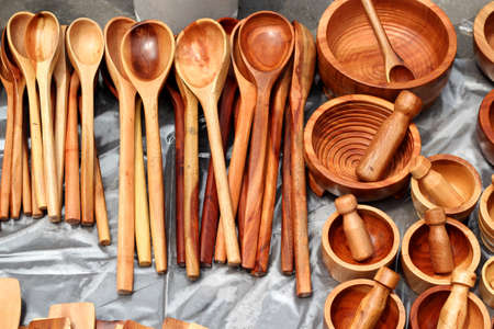 wooden handmade sugar basin spice mortar and other kitchen utensil tools sold in outdoor street market fair.