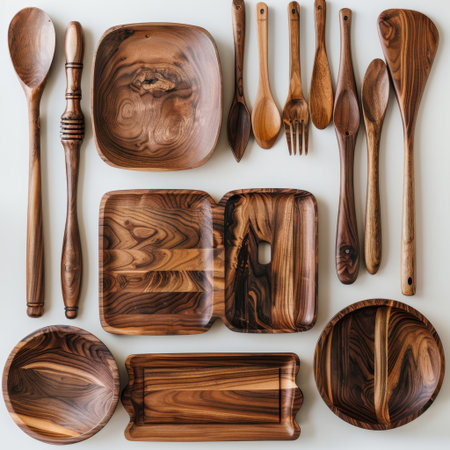 A beautifully arranged set of rustic wooden kitchenware including bowls, spoons, and utensils, highlighting the unique grain patterns and artisanal craftsmanship ideal for any kitchen.