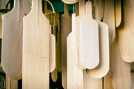 Handmade Wooden Spatulas Hanging At Outdoor Market