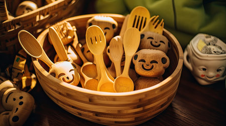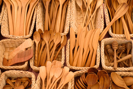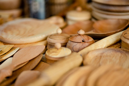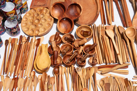 Handcrafted wooden spoons, forks and kitchen tools displayed in market stall in natural earthy tones. Concept of sustainable design, handmade craft, rustic aesthetics