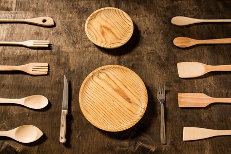 Set of wooden kitchen appliances, spoons, scoops, forks and knives. View from above.