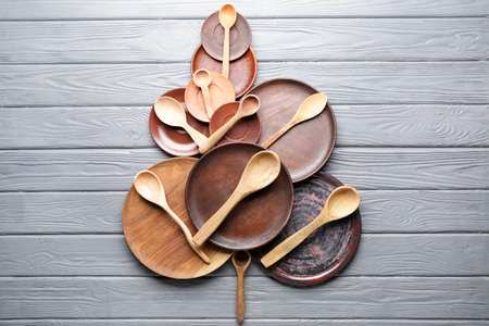 Beautiful Christmas tree made of plates and spoons on wooden background