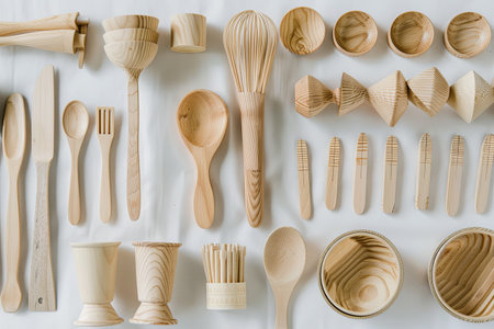 A top view of an assortment of wooden kitchen utensils and craft tools displayed on a natural material backdrop, showcasing the beauty of artisan craftsmanship.
