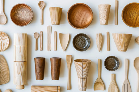 Wooden spoons, bowls, cups, and other kitchen tools arranged on a white surface.